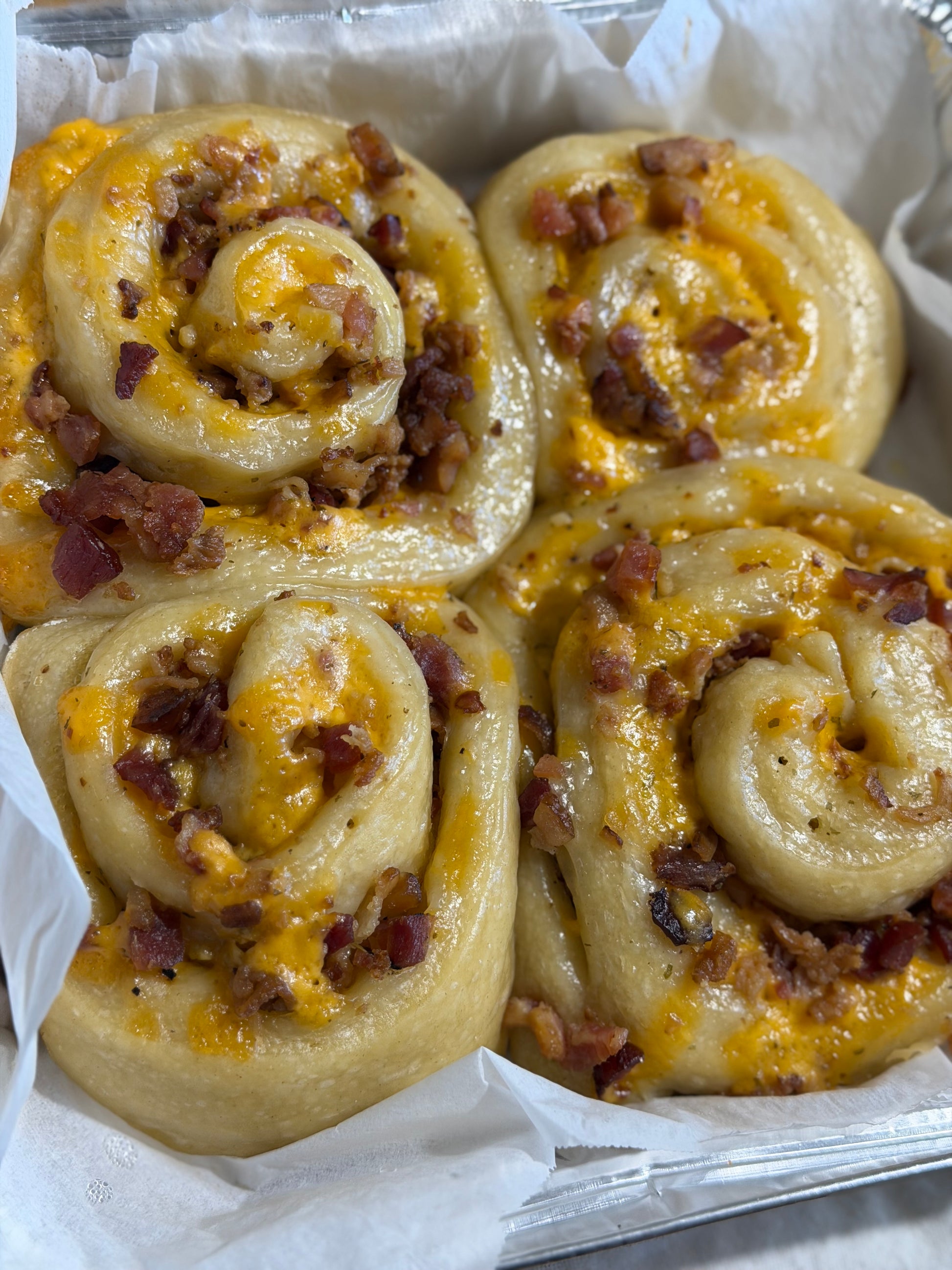 Mouth watering savory, buttery goodness. These savory rolls are a twist on our popular cinnamon rolls, filled with butter, garlic and herbs, loads of bacon and cheese. These are best served warm, with your meal or on their own. Tasty treats all the way around, these can be customized, just reach out and we can get yours ready for you. 24-72hr turn around.